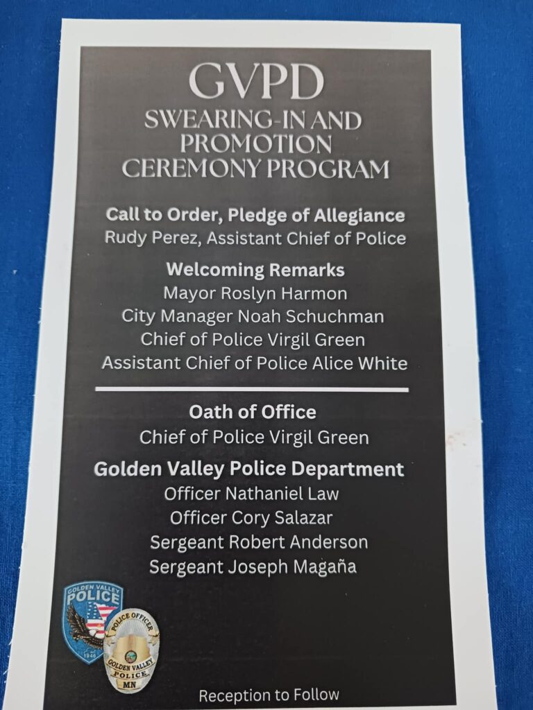 Monday, December 2nd we had the privilege to host a reception for the swearing in ceremony for our 2 new officers and the promotion to Sargeant for 2 of our officers. Mayor Harmon congratulated our new officers and Sergeants and welcomed them and their families to our city. City Manager Noah Schuchman talked about what a noble career these people have chosen. He reiterated how grateful we are to their families. Chief Green told us about a first for him, deep frying a turkey in the snow, it’s Minnesota after all! Thank you to our Assistant Chiefs Alice White and Rudy Perez for their dedication to our city, we appreciate you!